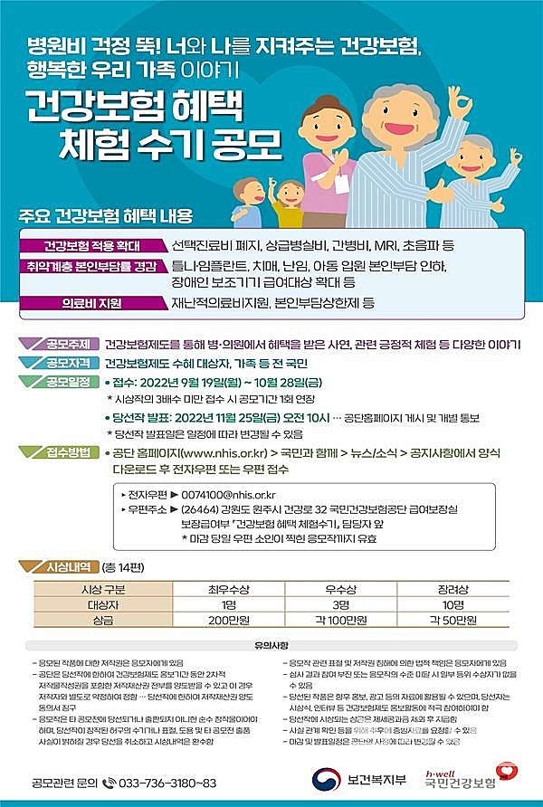 우편 접수자의 경우 (26464) 강원도 원주시 건강로 32, 국민건강보험공단 급여보장실 '건강보험혜택 체험수기' 담당자 앞으로 발송하면 된다.