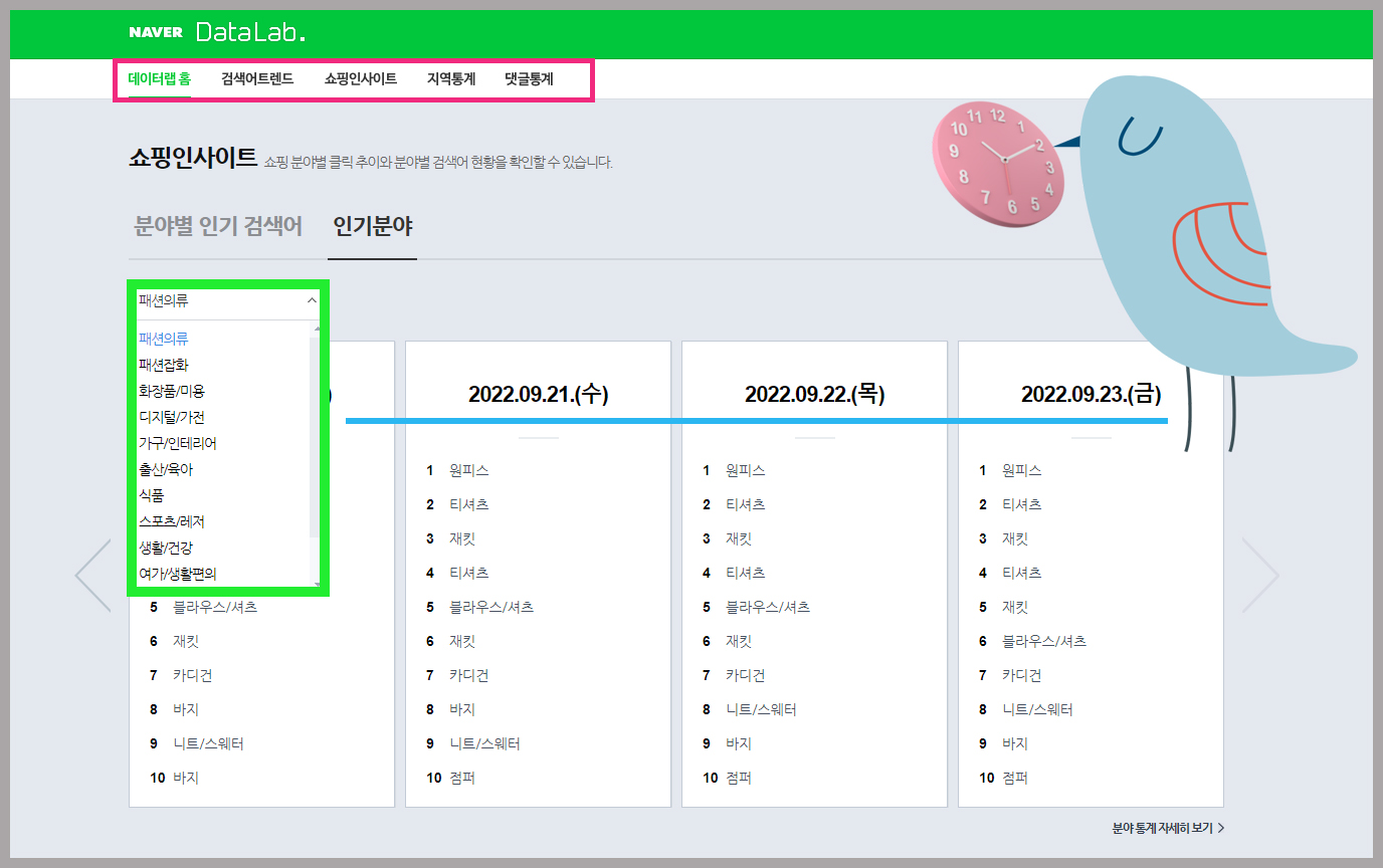 네이버 데이터랩의 경우 일별로 인기상품은 물론 그래프로 인기정도 , 통계까지 모두 확인이 가능하다.