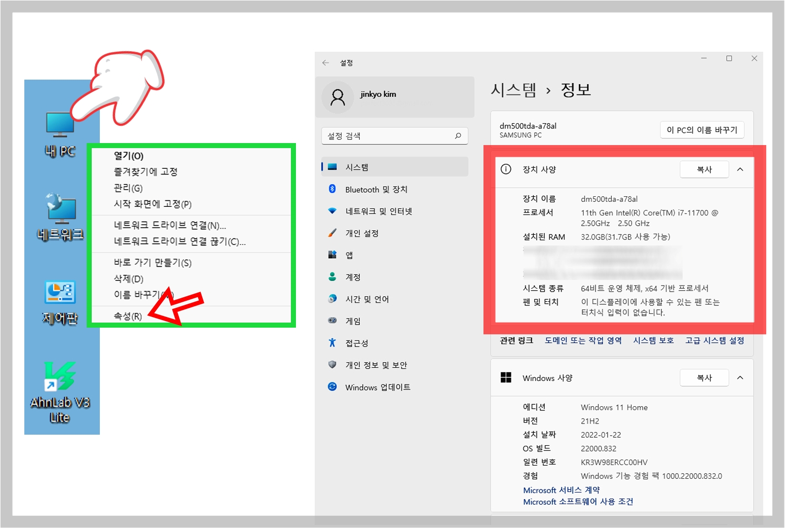 4. 정보 (장치 사양, pc이름바꾸기 등) 클릭 .→ 위 사진의 우측 이미지와 동일한 내용이 나타남