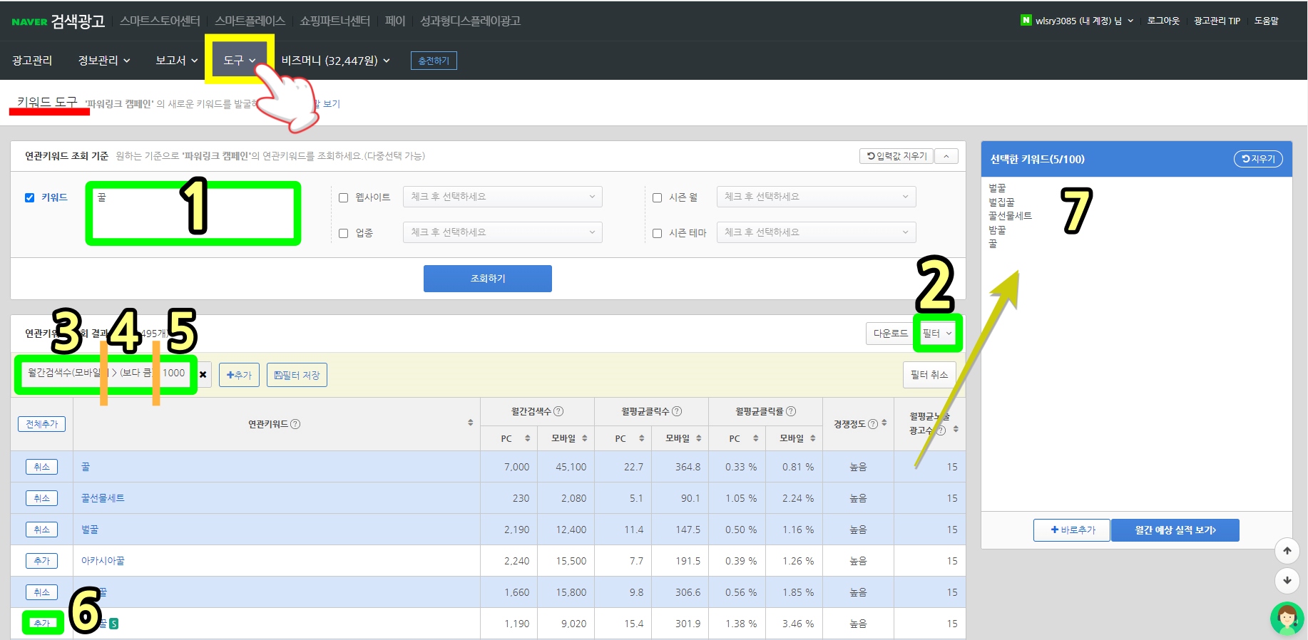 하단의 창에서 6과 같이 가장 조회수가 많은 것들을 추가해 주면 7과 같이 선택한 키워드가 나타난다.