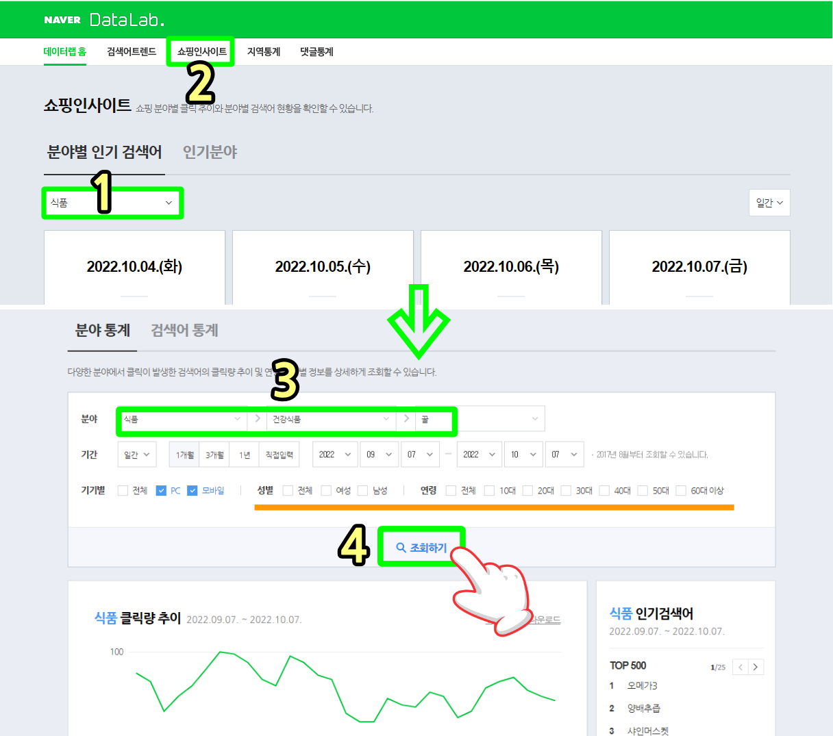 4. 원하는 성별이나 연령이 있다면 체크해 주거나 아닌 경우 전체를 체크하고 조회하기를 크릭 하면 하단에 상세한 통계를 볼 수 있으며 인기 검색어까지 나타난다.