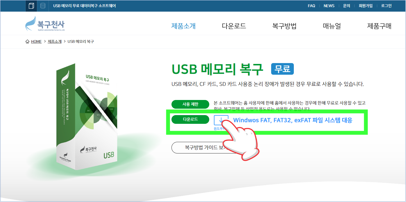 먼저 위 링크로 들어가 복구 천사 홈페이지로 접속합니다. > 그림과 같이 무료 파일 다운로드 화살표를 클릭해주세요
