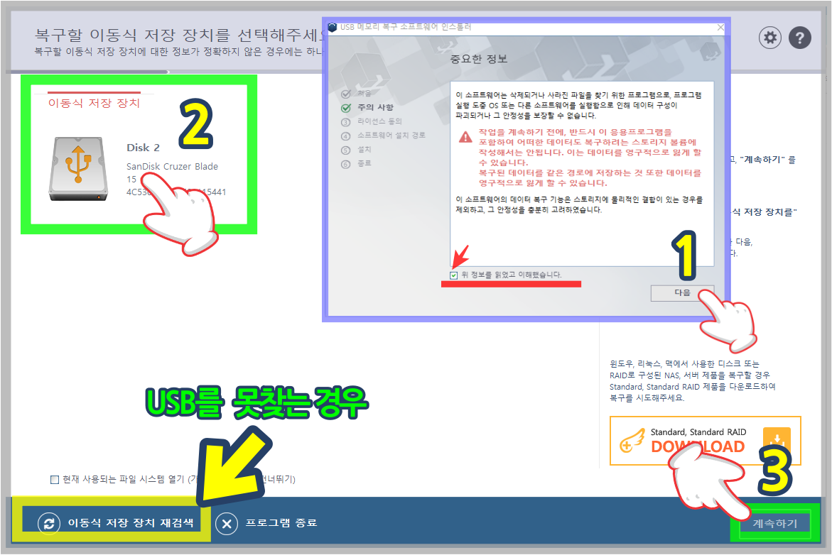 2. 이동식 저장장치 탭 > 3. 계속하기 클릭 ---- 만약 이동식 디스크를 찾지 못하는 경우 좌측 하단 저장장치 재검색해주세요
