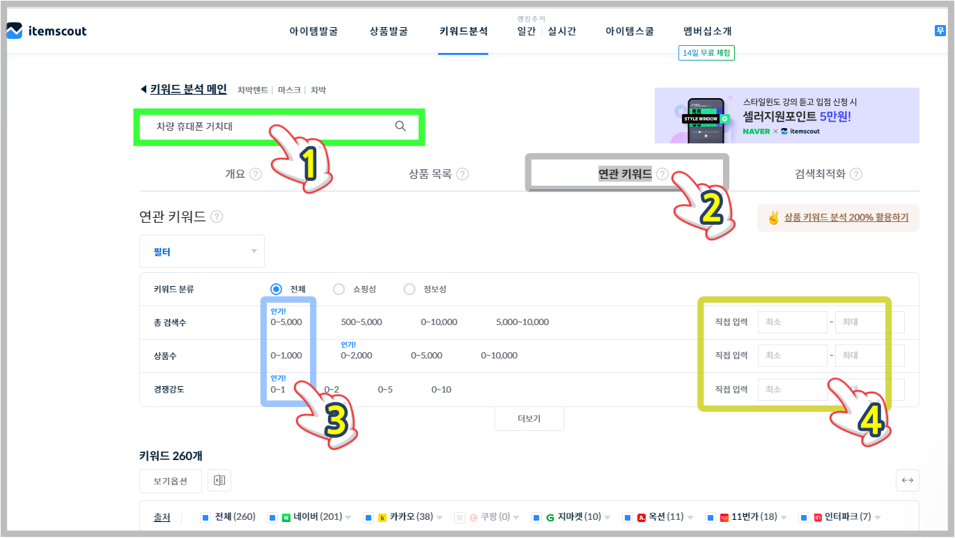 4. 상품수와 검색수, 경쟁 등 원하는 내용을 직접 입력도 가능하다.
