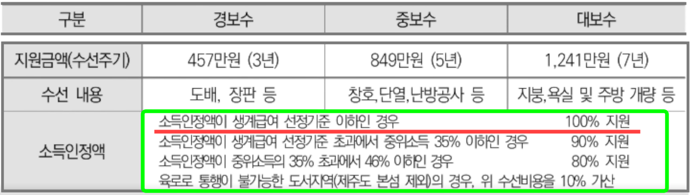 생계급여 산정 기준 이하자의 경우에 해당하면 수선 비용 100%를 전액 지원받게 되며 중위소득 35% 이하인 경우는 보수비용의 90%이다.