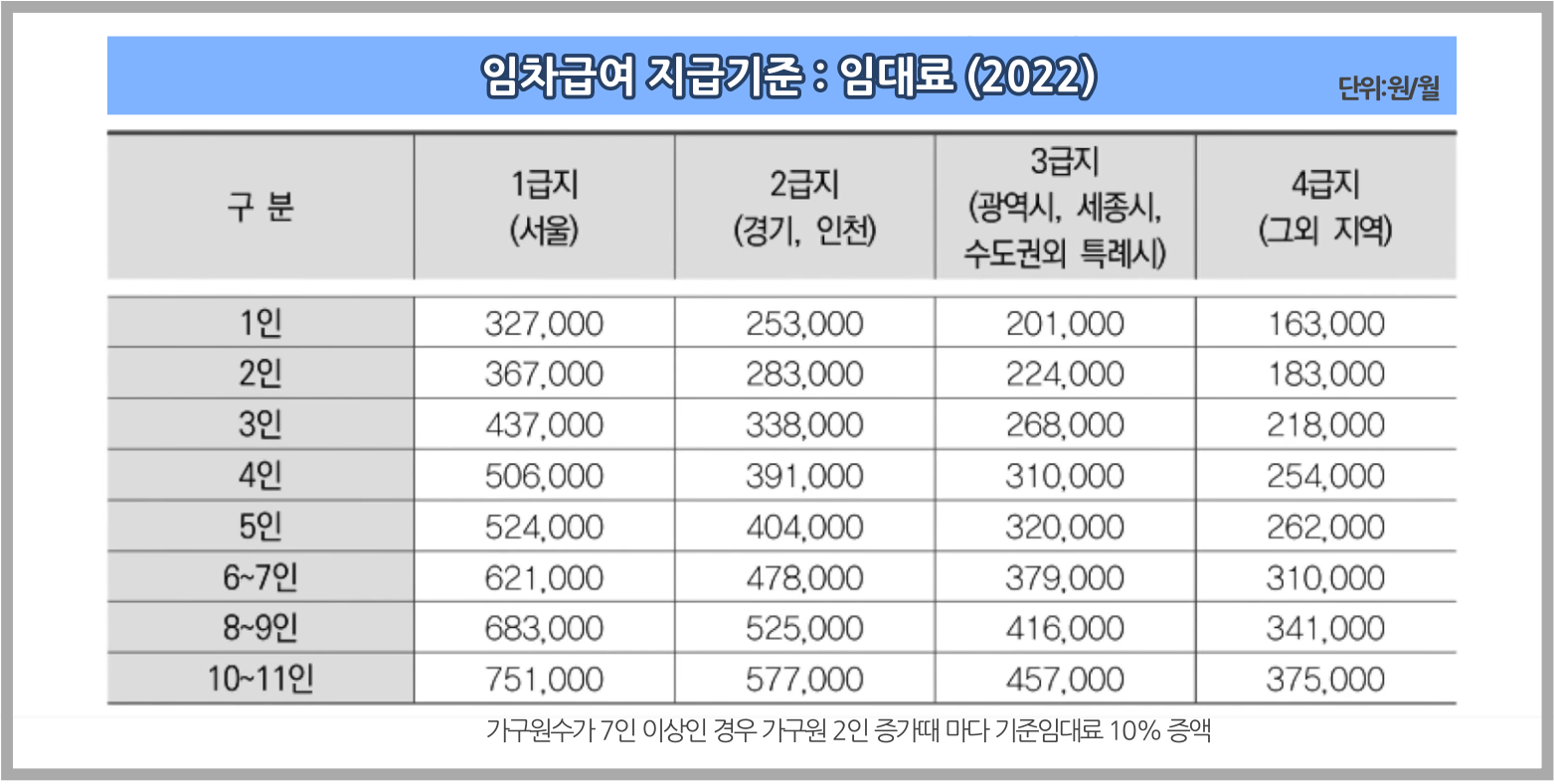 월세는 매월 거주 지역별로 1 급지에서 4 급지로 나눠서 기준에 맞는 금액 내에서 월세 급여를 지급받을 수 있다.