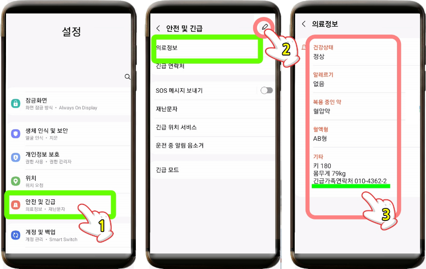 기종에 따라 다소 차이가 있지만 설정 (톱니바퀴) > 안전 및 긴급 > 의료정보를 탭 해준다.