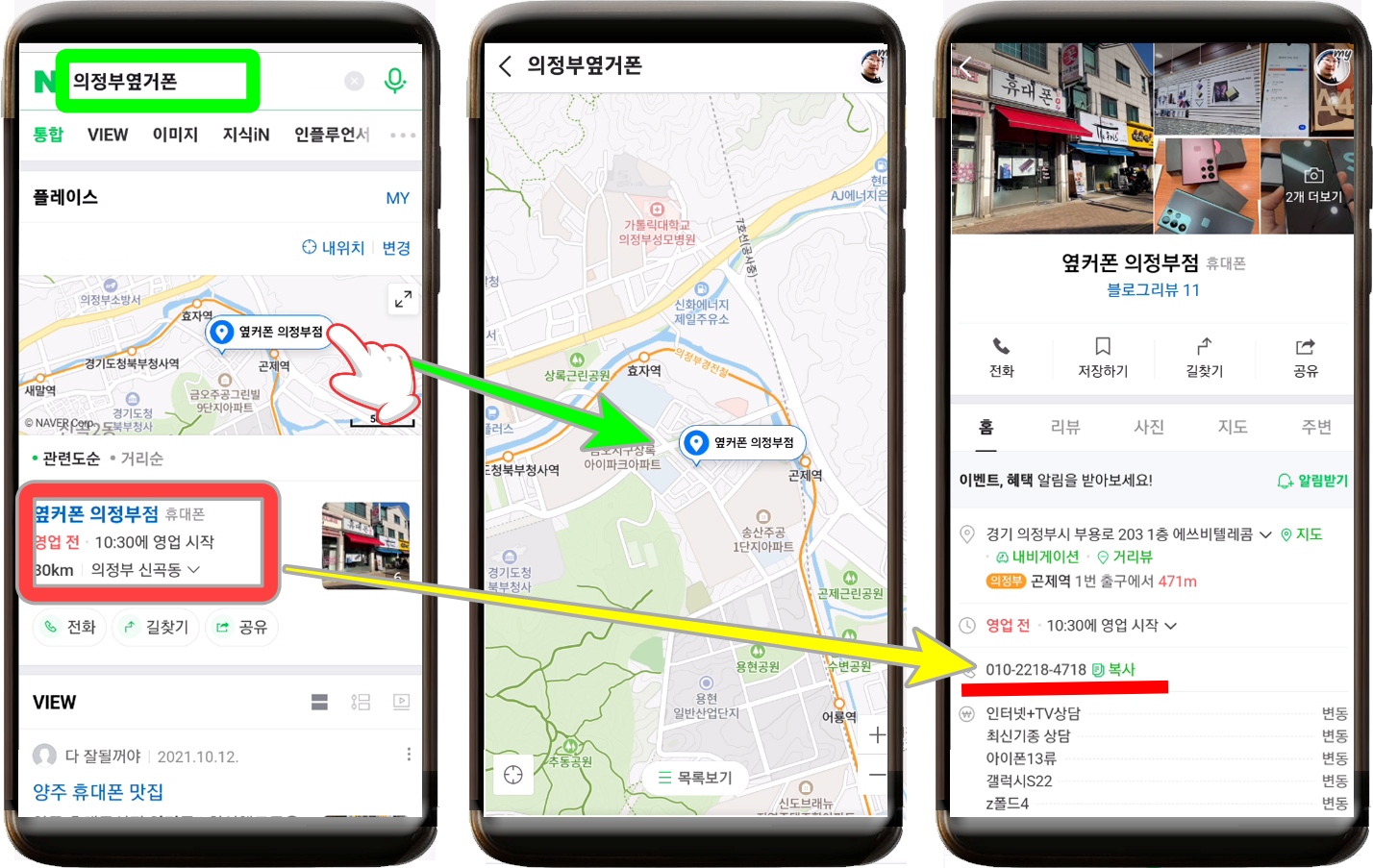 휴대폰에서 네이버 엡으로 접속 → 검색창에서 신촌, 의정부, 수원 등 집에서 가장 가까운 지역+ 옆 거 폰이라고 검색하면 바로 뜬다.